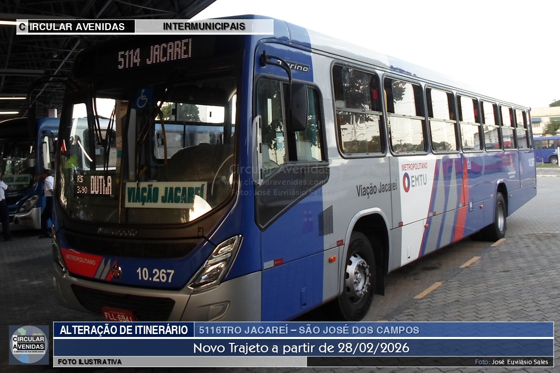 28/02/2026 | JACAREÍ/SP – A partir de hoje, 28/02/2026, a linha 5116TRO Jacarei – São José dos Campos, via Estrada Velha, linha metropolitana do Vale do Paraíba, passou a fazer novo trajeto.